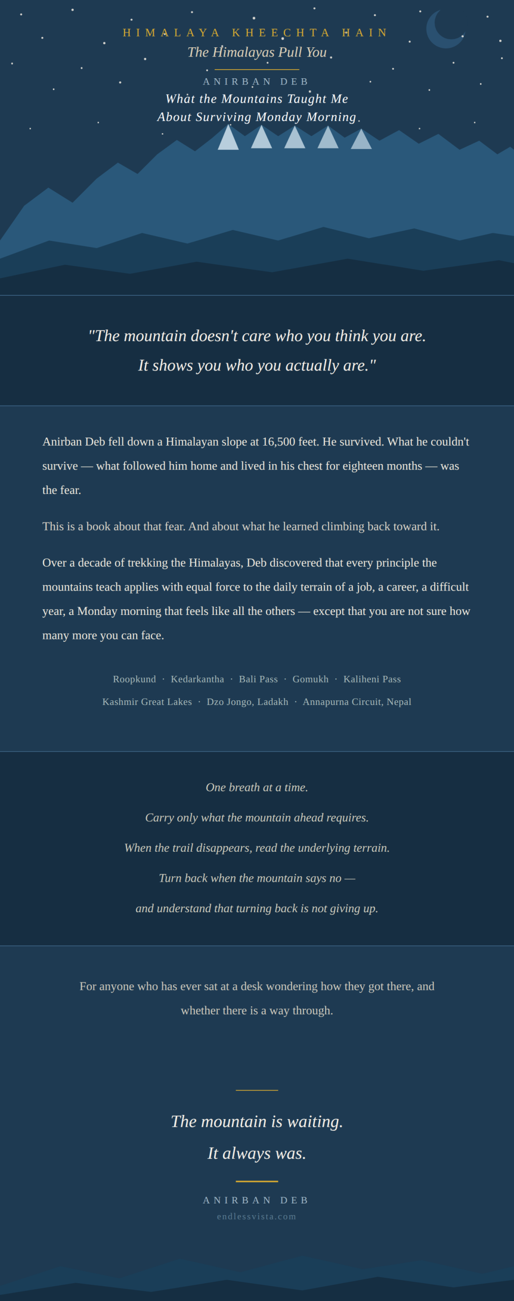 “The mountains are a mirror. This book is the reflection. Walk with me.”  … Anirban Deb